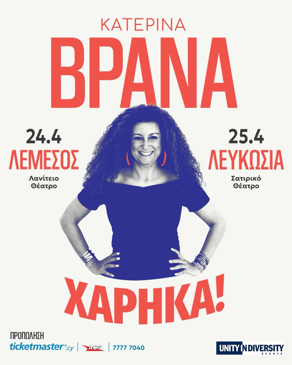 Η Κατερίνα Βρανά έρχεται στην Κύπρο με την παράσταση «Χάρηκα!» – Δυο βραδιές ξεκαρδιστικού stand-up comedy Λεμεσός 24 Απριλίου και Λευκωσία 25 Απριλίου